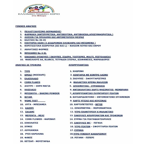 Παρακάτω επισυνάπτουμε φωτογραφία με τις ανάγκες του Παιδικού Χωριού του Φιλύρου και σας καλούμε να έρθετε στα επόμενα παιχνίδια της Arsenal στη Μπαλταδώρου 8 φέρνοντας ό,τι μπορείτε από τη παρακάτω λίστα. Θα συγκεντρωθούν όλα τη μέρα του φιλικού αγώνα και θα σταλούν στο παιδικό χωριό από αντιπροσωπεία του τουρνουά FCLT. Όποιος θέλει μπορεί να κοινοποιήσει και τη φωτογραφία στα social media του.